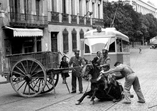Madrid, 1952.- Una mula que tiraba de un carro cae delante del